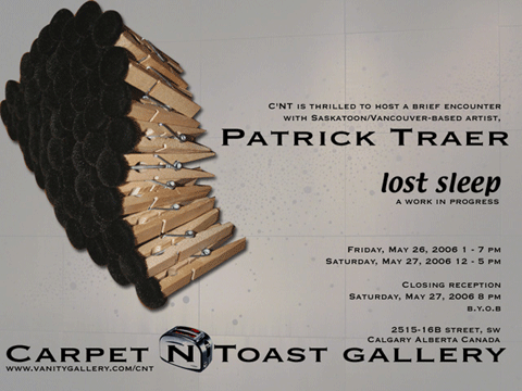 Patrick and I were both in Regina in January and I had the privilege of seeing his stunning new work in an exhibition at Neutral Ground. This work is an experiment with seductive materials and lighting and the installation created a dreamy, eroticized environment. While the embroidered silk murals are grand, breathtaking and incredibly sexy, I was drawn to the work lost sleep tucked away behind one of the murals. I asked Patrick to recreate this piece for the C'NT gallery.